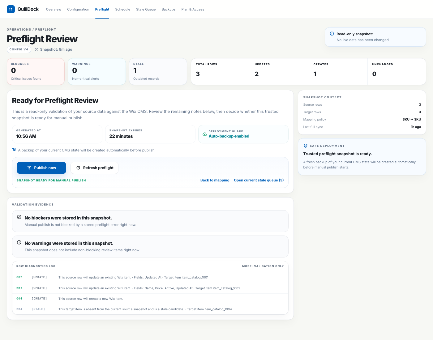 QuillDock is not trying to turn a worksheet into a general automation engine. It focuses on the publish step between one sheet and one Wix CMS collection.