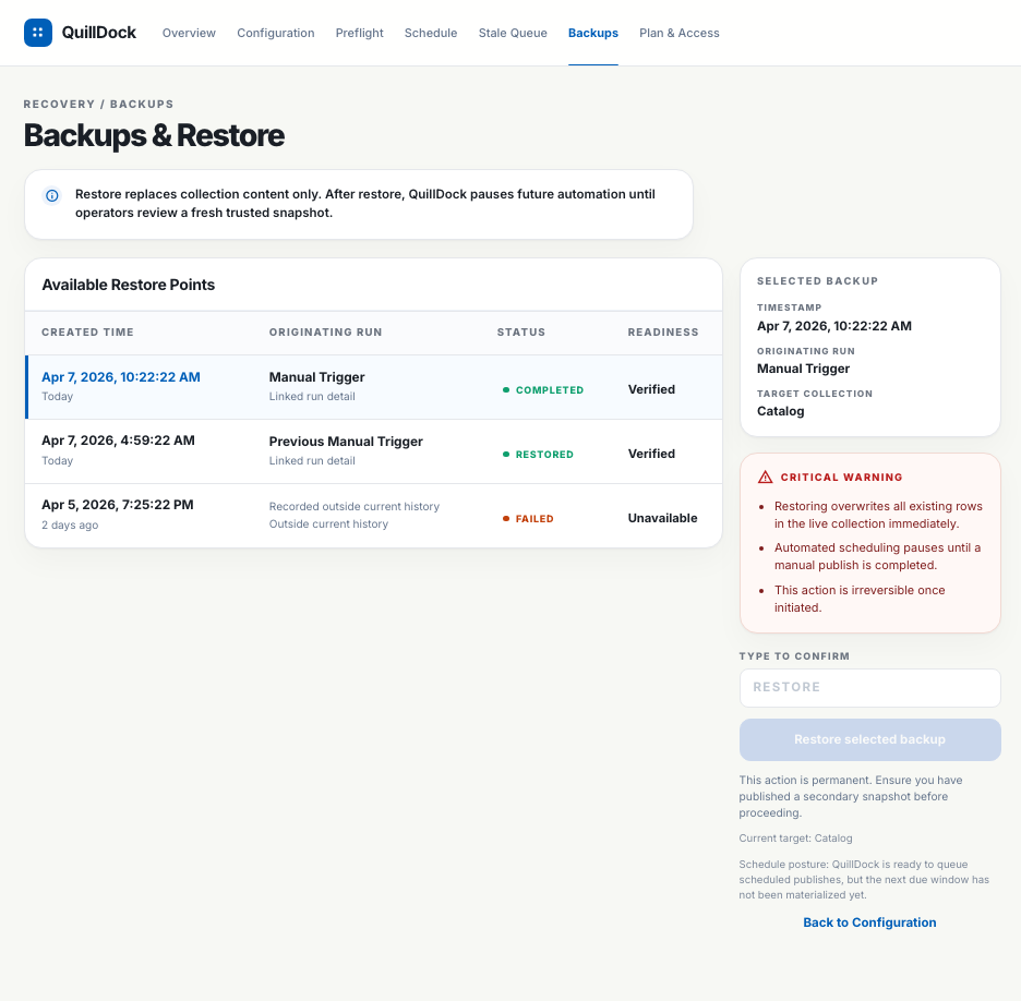QuillDock is a strong fit for structured staff or leadership collections that change repeatedly, need visible preflight review, and benefit from a recovery path you can inspect after publish.